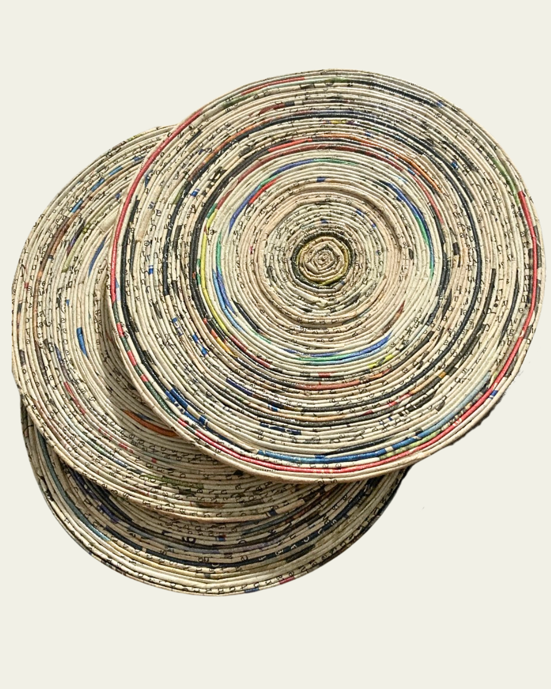 Sustainable tableware and décor, including these handcrafted coasters made from recycled paper to add rustic finishes, designed to bring artisanal charm to modern spaces.
