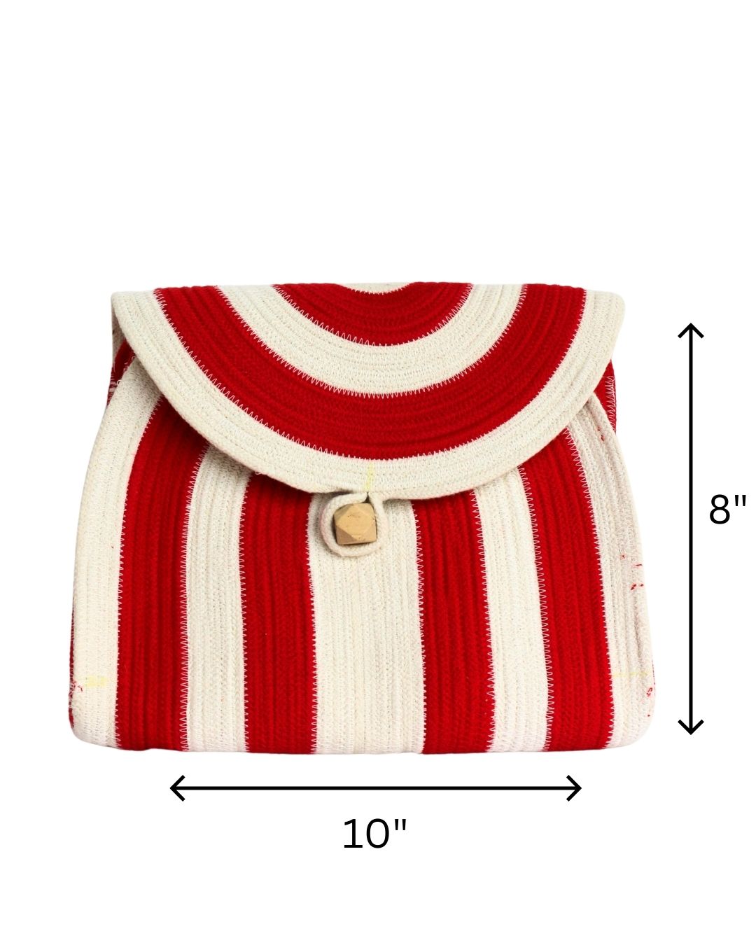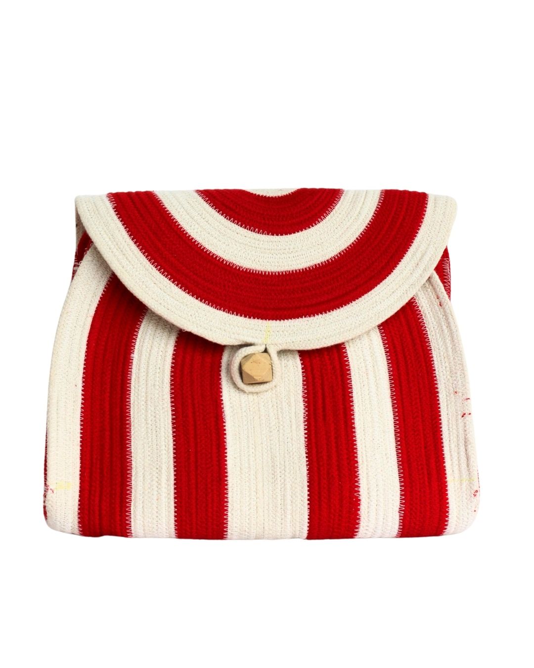 Handcrafted red and off-white cord tote clutch with a chic wooden button—stylish, durable, and perfect for any occasion.