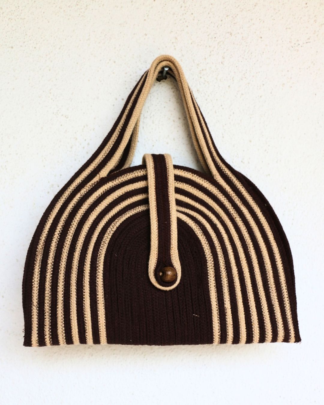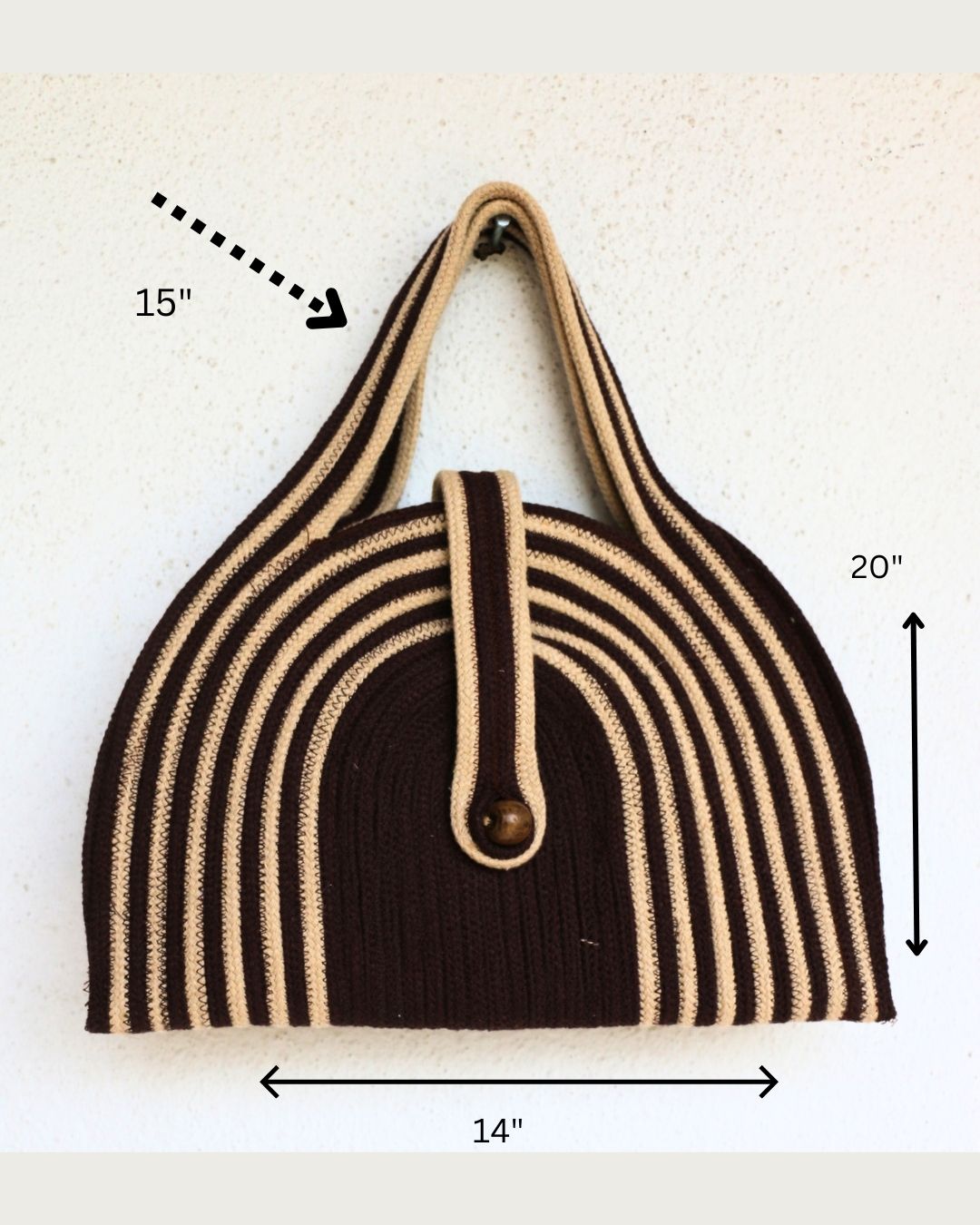 Elegant black cord tote clutch with beige accents, featuring a chic wooden button closure. Stylish, durable, and perfect for any occasion.