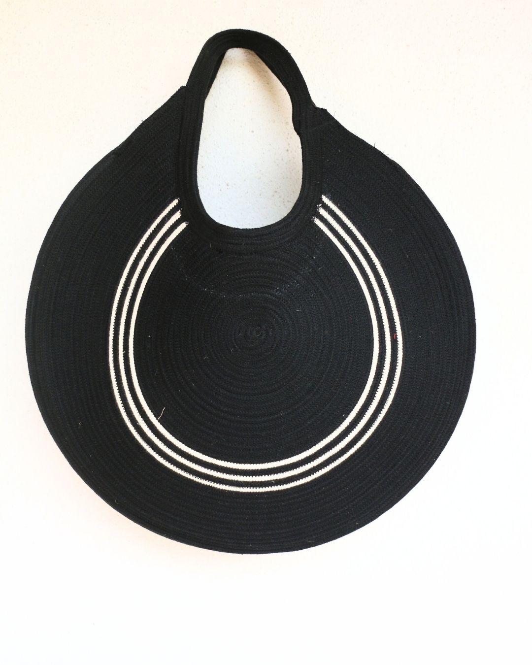 Elegant handmade tote clutch bag crafted from durable black cord with chic white accents. Stylish, versatile, and perfect for any occasion.