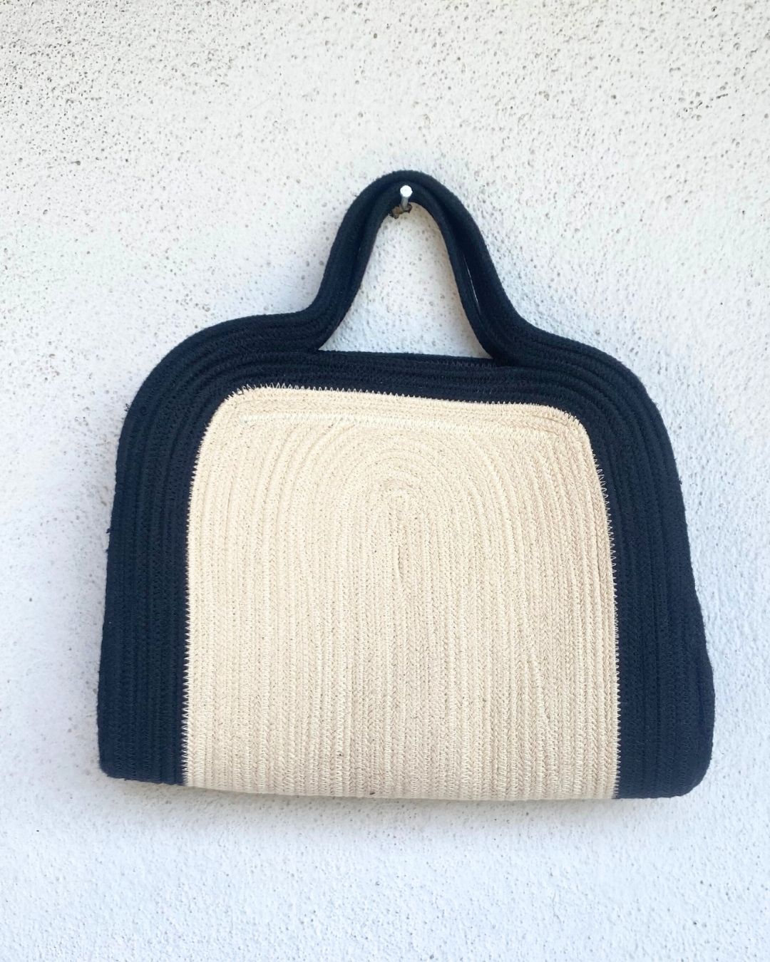 Elegant handmade tote clutch bag crafted from durable white cord, featuring a sleek black-edged border for a chic, modern contrast.