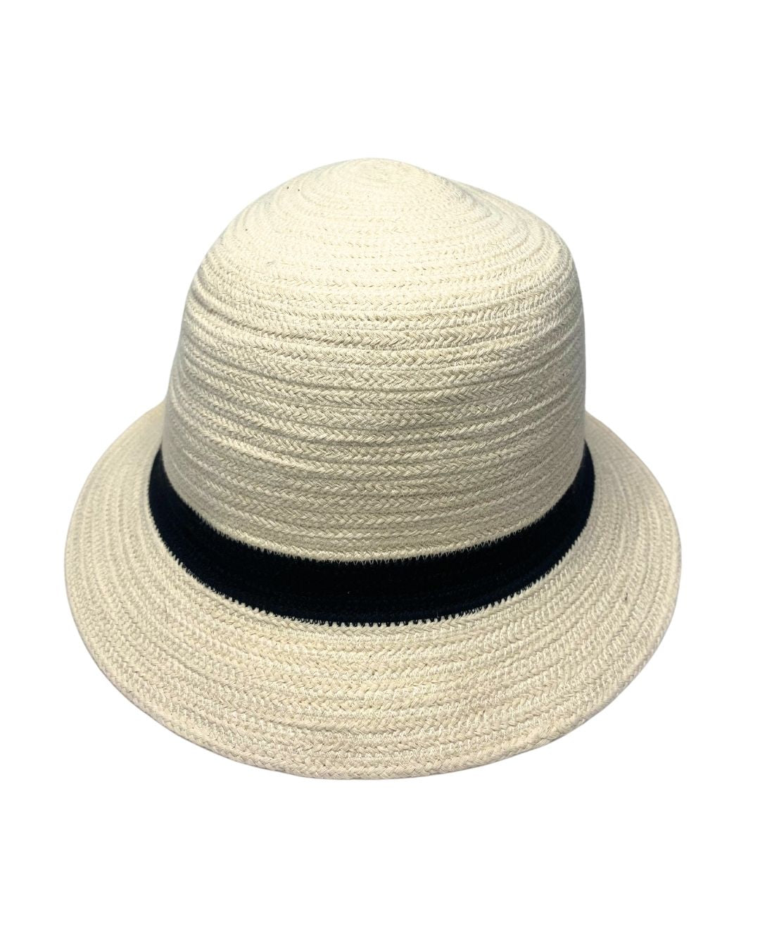 This women's handcrafted bucket hat, made from durable cord, features an off-white body with a stylish black border.