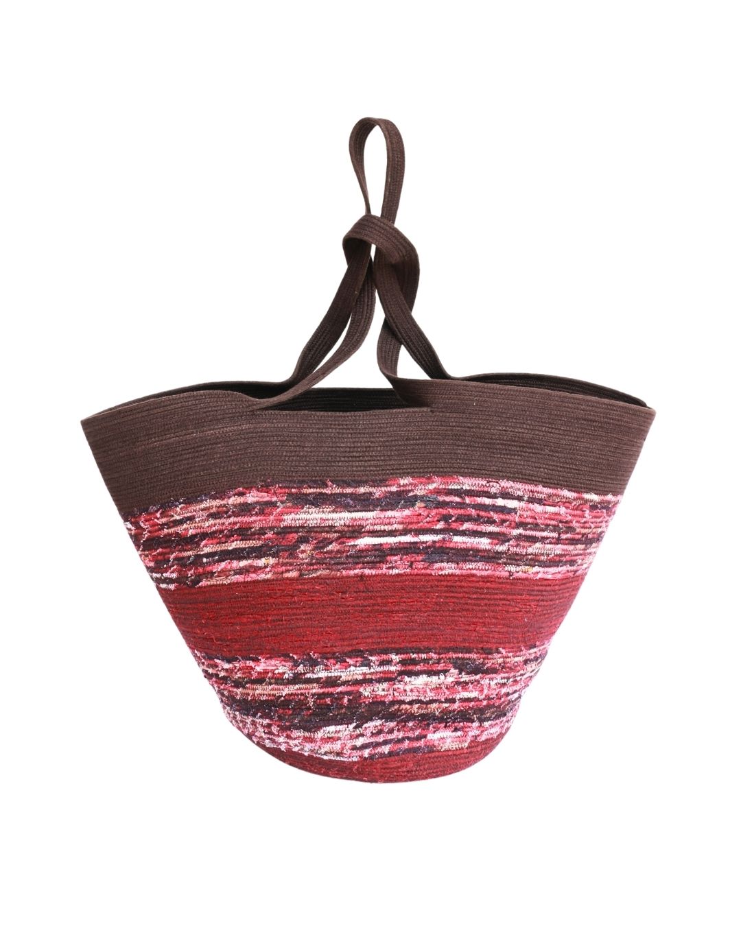 Eco-friendly tote bag handcrafted from mixed scrap cord, featuring a unique woven design, durable construction, and a stylish, sustainable touch.