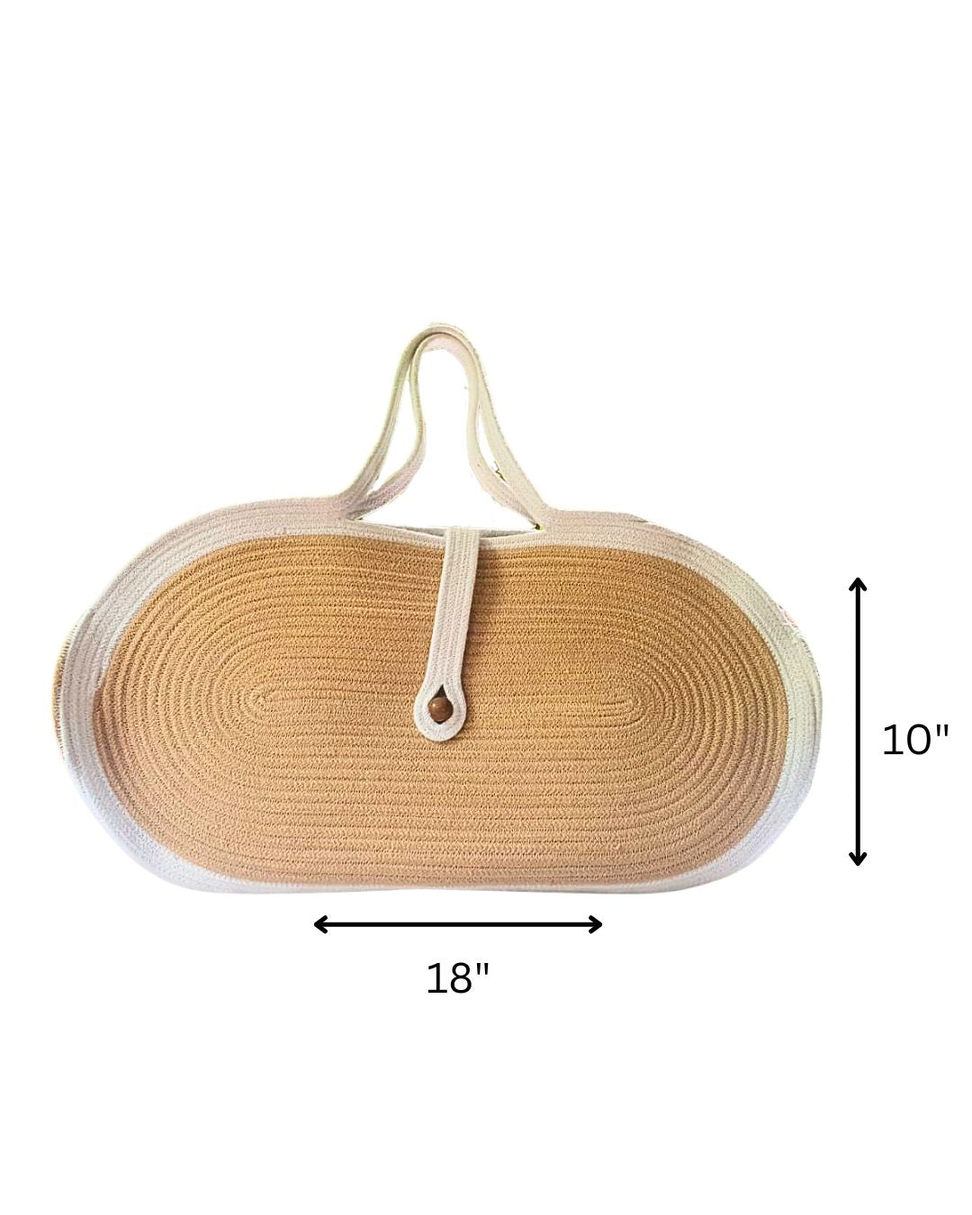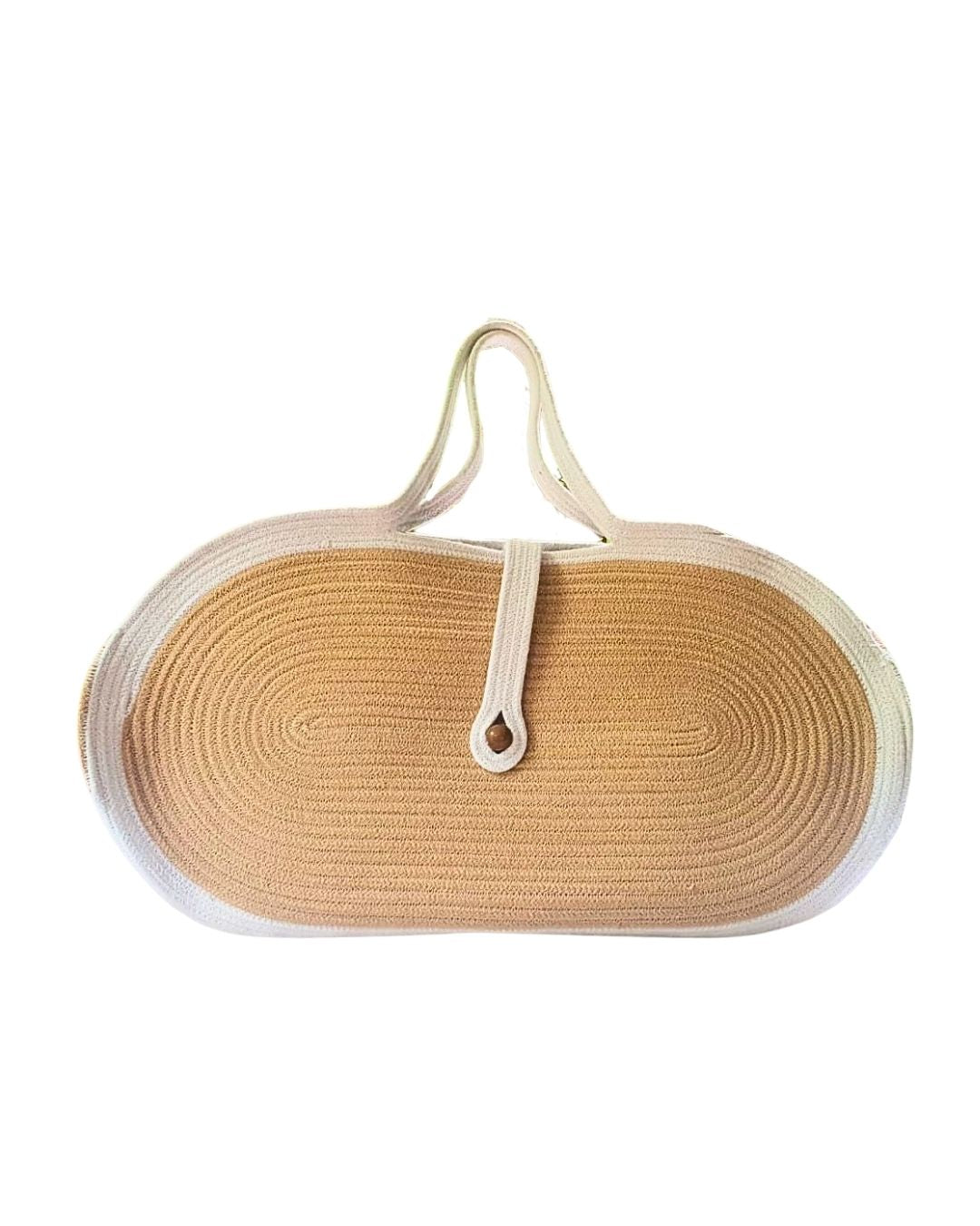 Elegant biscuit brown tote clutch with off-white edges, featuring a chic wooden button closure. Stylish, durable, and perfect for any occasion.