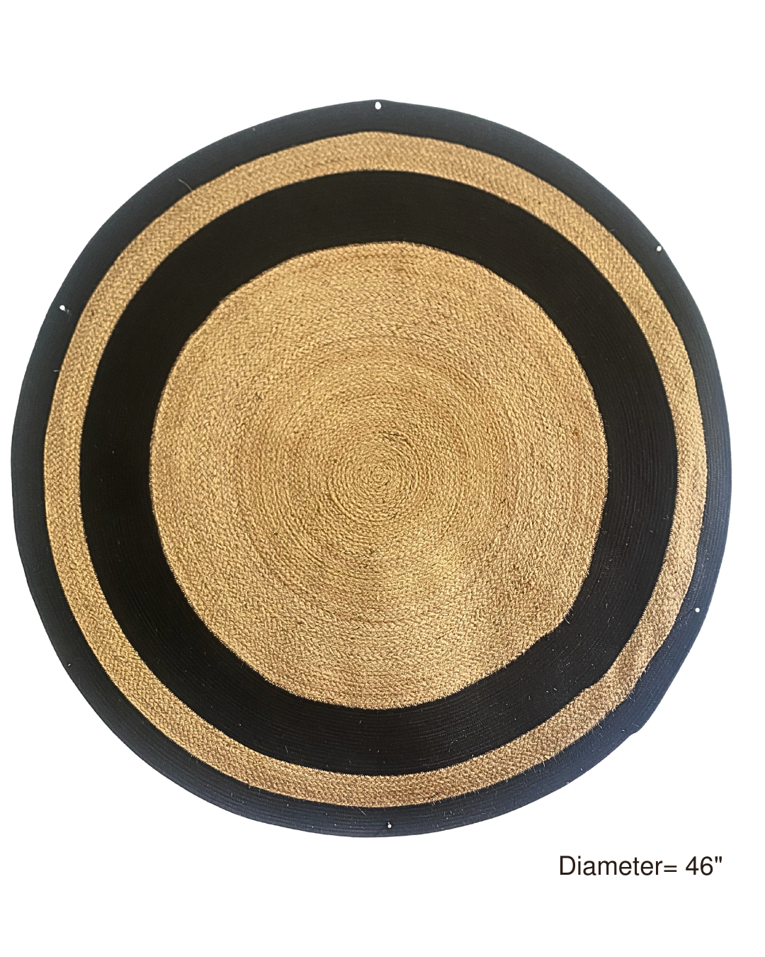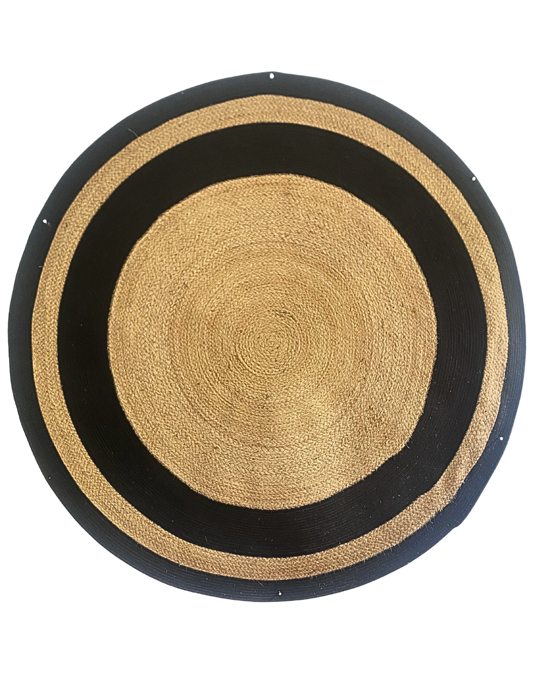 Handwoven circular rug crafted from natural jute and black cotton cord, combining durability with modern, textured, eco-friendly style.