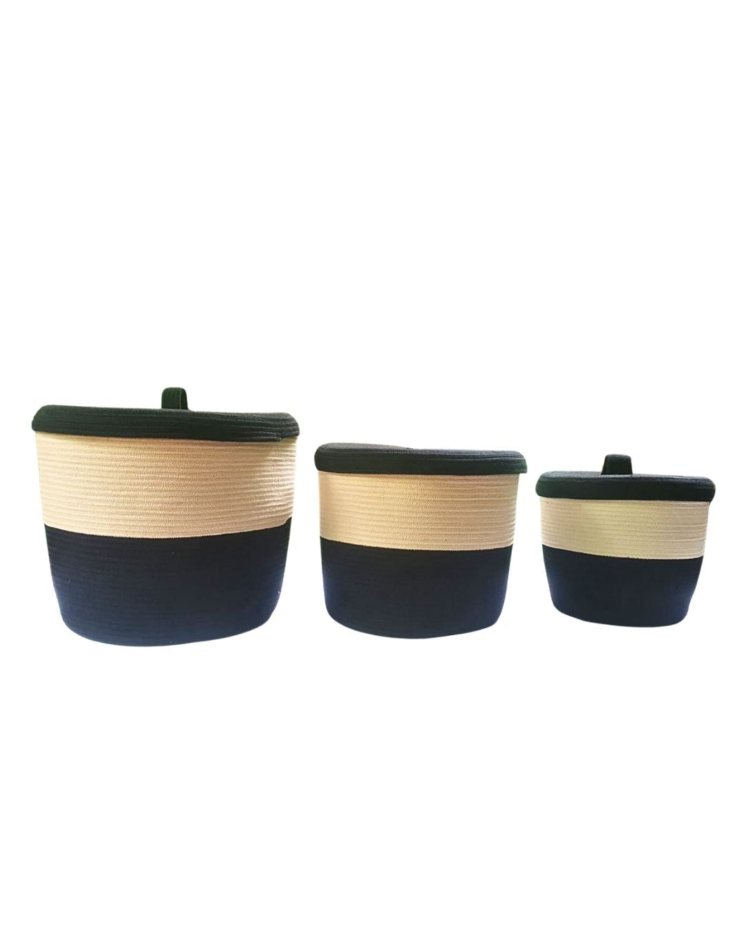 Handcrafted from 100% cotton cord, this stylish black and beige basket set is perfect for organizing, storing essentials, or doubling as chic plant holders — a versatile touch for any space.