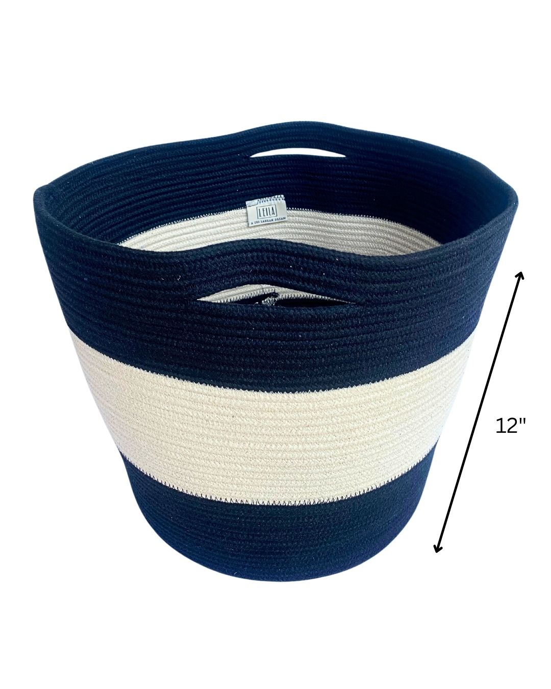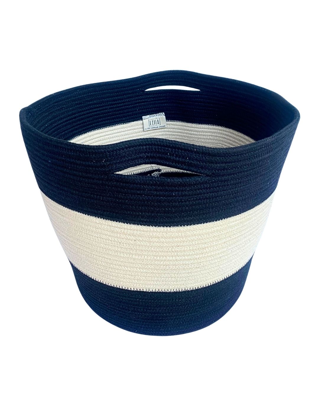 This handcrafted plant sleeve features a dark blue and white cord design, adding a stylish, unique touch to any plant.