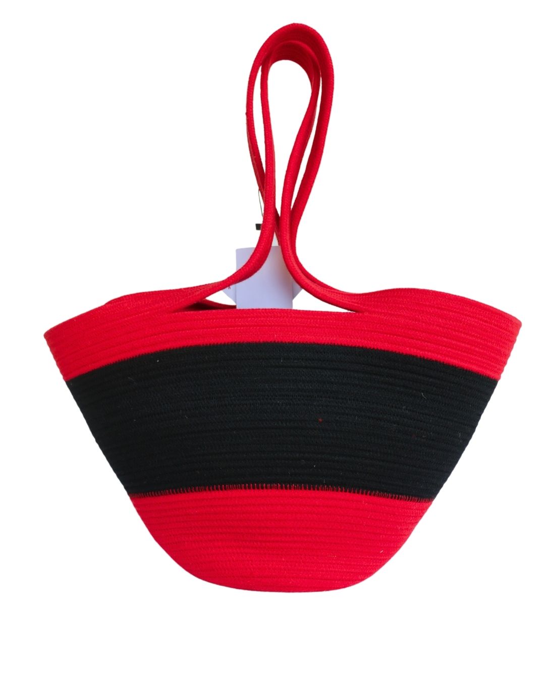This handcrafted two-toned tote bag, made from durable red and black cord, offers a stylish, sturdy, and eco-friendly carryall for everyday use.
