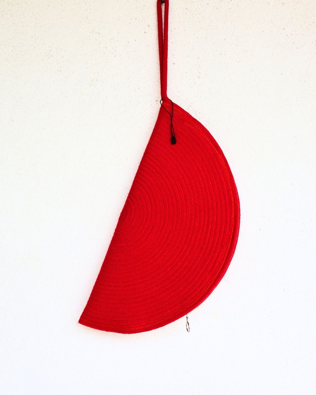 Elegant red half-moon tote clutch handcrafted from durable cord, featuring a sleek design, sturdy handle, and versatile day-to-night style.