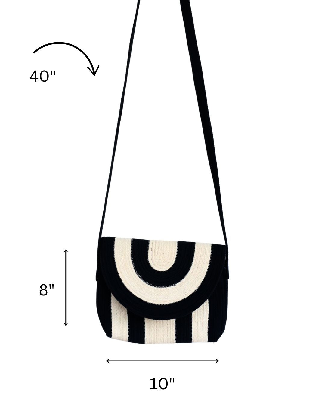 Stylish black and off-white side bag handcrafted from durable cord, featuring a unique woven design, perfect for everyday wear and essentials.