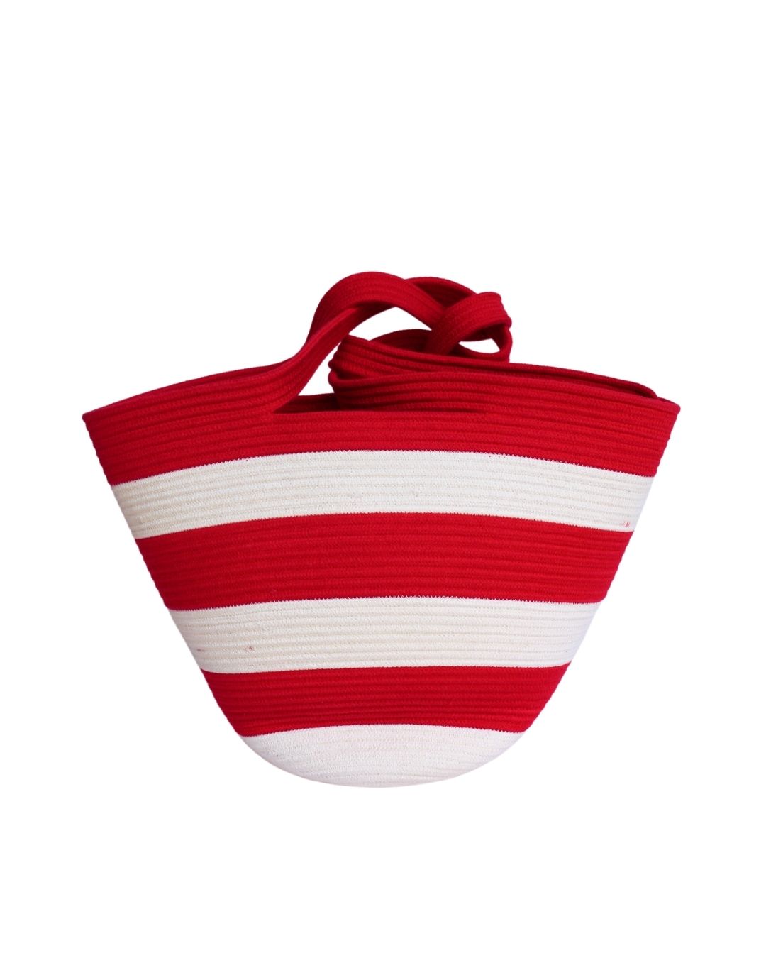 Stylish three-layered tote bag crafted from durable cord in white and red. Handmade, sturdy, and perfect for everyday use.